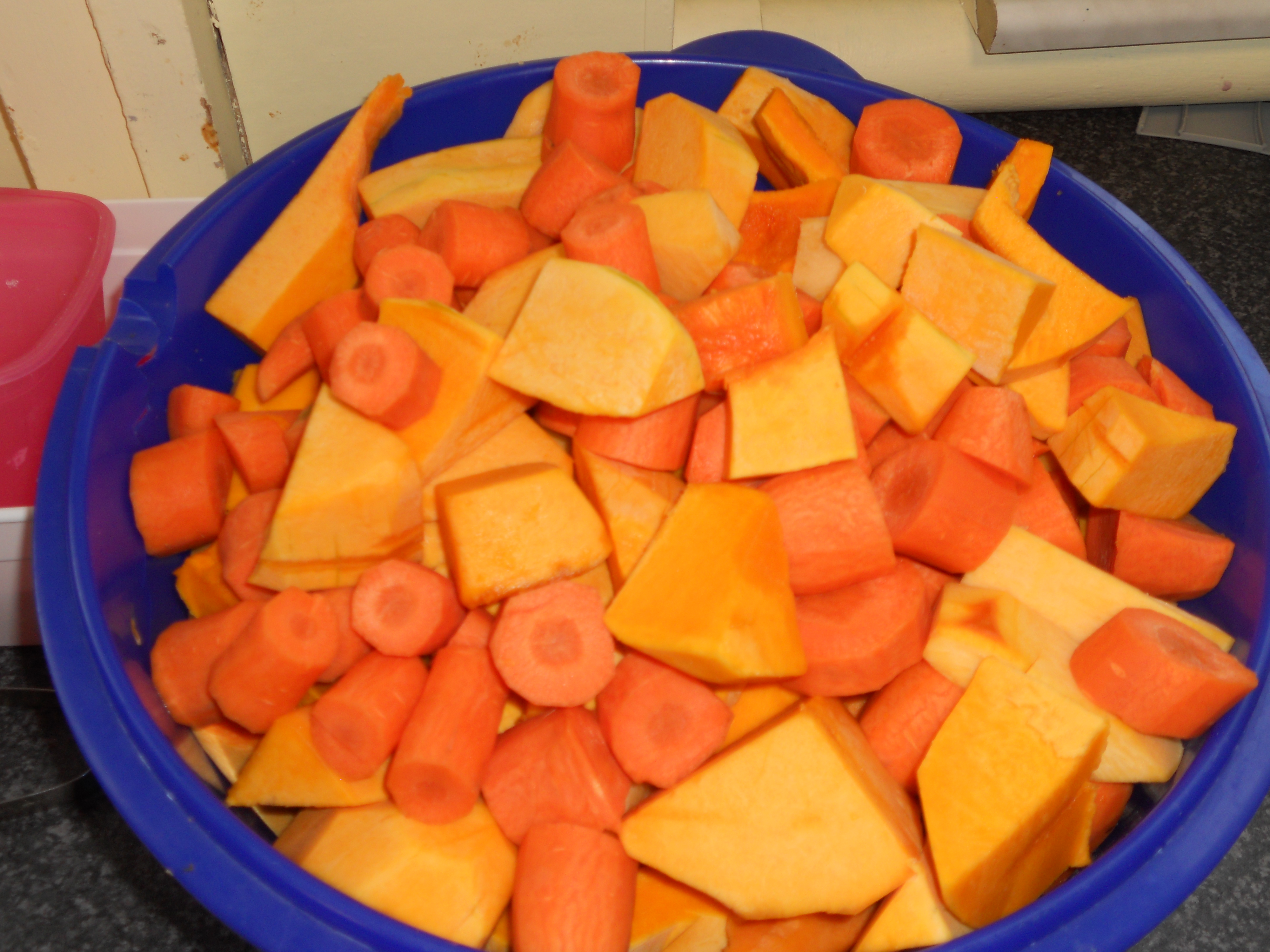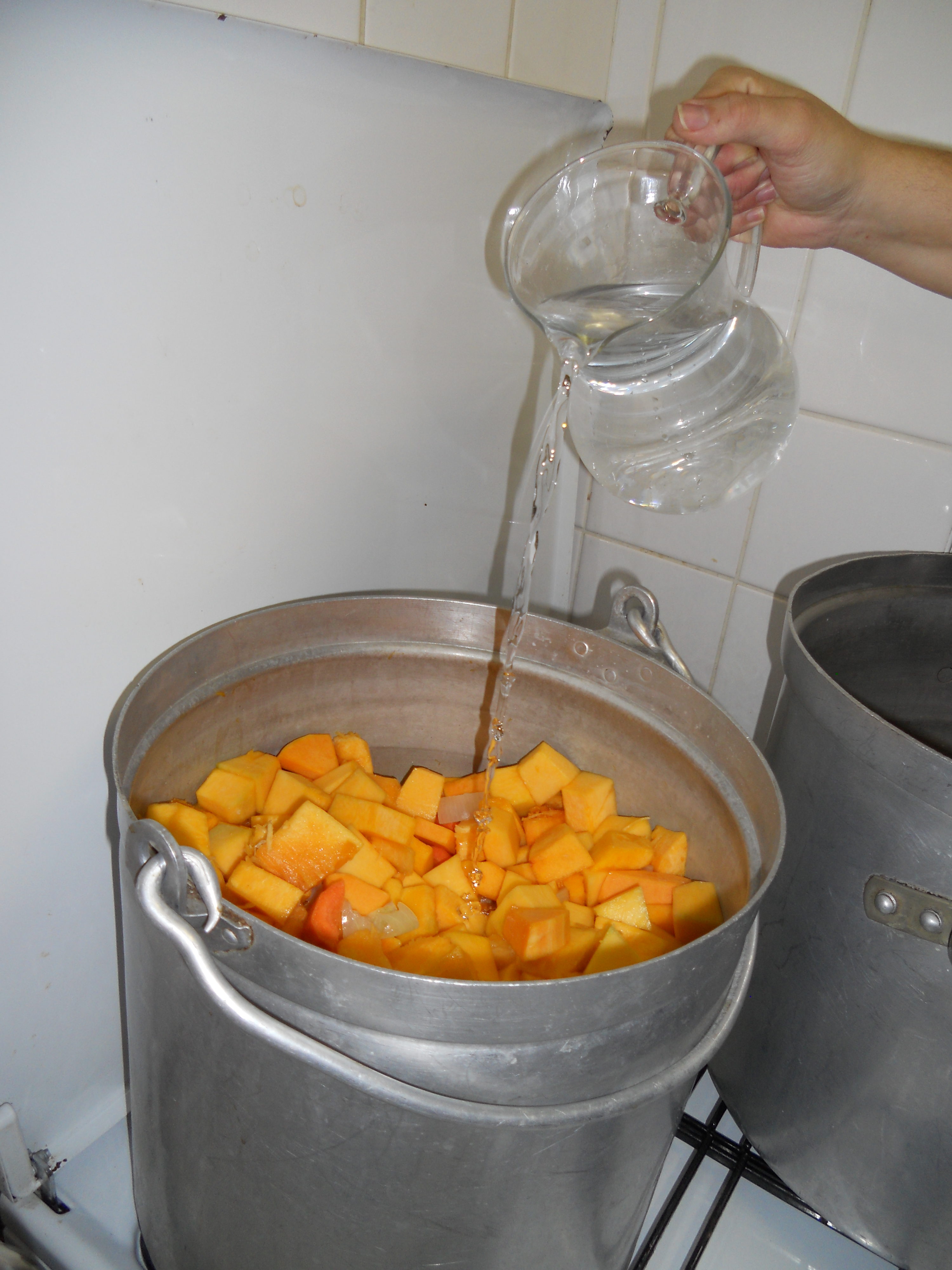 Toutes les classes maternelles étaient mélangées pour cuisiner. Les plus grands ont pris en charge les plus petits. Munis d’un couteau en plastique (aucun doigt de perdu 😛 ), ils ont découpé en petits morceaux l’ensemble des potirons et les ont déposés dans une bassine.